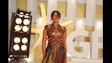 وتألقت بفستان جلد مموج بين الليموني، والأسود والبرجندي، بقصة انسيابية على الجسم "كب".