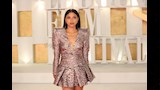واختارت تسريحة الشعر المرفوعة لأعلى، ونسقت مع إطلالتها كلاتش فضي وحذاء باللون الفضي.