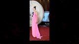 اختارت مايان فستان سهرة طويلًا بتصميم عمودي جاء بدون حمالات ليُبرز الكتفين والرقبة بأسلوب راقٍ وبسيط. تميّز الفستان بلونه الوردي الزاهي أو الفوشيا الذي أضفى على الإطلالة لمسة جريئة وأنثوية في الوقت نفسه.