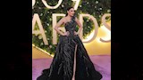 بينما ارتدت المطربة أنغام فستانا طويلا باللون الأسود اللامع الميتالك، ونسقت معه قفازات من الجلد بنفس اللون، واختارت وضع مكياج بدرجات الألوان الترابية.