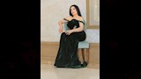 وارتدت عبير فستان طويل مصنوع من المخمل باللون الأخضر بصيحة الأوف شولدر تميز بأنه مزينا بتطريزات باللون الذهبي، من تصميم مصممة الأزياء سماح مهران.