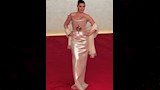 ظهرت أروى بفستان طويل باللون البيج المصنوع من الساتان اللامع، بتصميم كب مزين بوردة ذهبية عند منطقة الصدر، ونسقت معه شال باللون نفسه لإكمال الإطلالة.