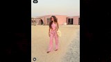 ترتدي فستان ماكسي صيفي بألوان بارزة من الأخضر والوردي، مع نقوش وورود، ما يعطي الإطلالة طابع بوهو أنيق.