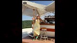 ارتدت فستانًا طويلًا باللون الأصفر الفاتح، مع قبعة بيضاء أنيقة مزينة بتفاصيل مميزة.