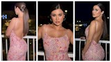وظهرت هدى مرتدية فستانا طويلا بقصة ضيقة على الجسم باللون الوردي.