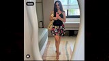 ظهرت بتوب أسود بلا أكمام برقبة مزمومة، وتنورة طويلة شيفون بألوان مائية (أزرق، تركواز، أبيض).