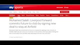 قالت شبكة سكاي سبورتس، إن محمد صلاح جدد تعاقده وسط تكهنات تربطه بالانتقال بعيدًا، ويشكل هذا الأمر دفعة قوية لليفربول في ظل تألق اللاعب هذا الموسم، مما ساعد النادي على الاقتراب من لقبه العشرين في الدوري.
