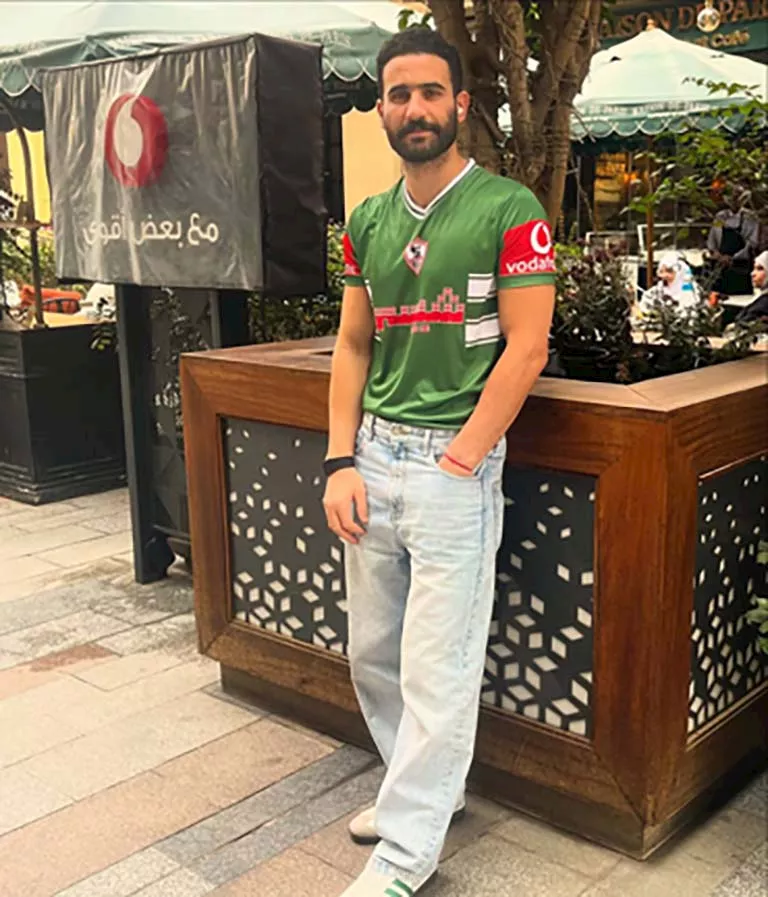 آزر باسم مرسي لاعب المجد الليبي الحالي والزمالك السابق، القلعة البيضاء، قبل مباراة بيراميدز في نصف نهائي كأس السوبر المصري.